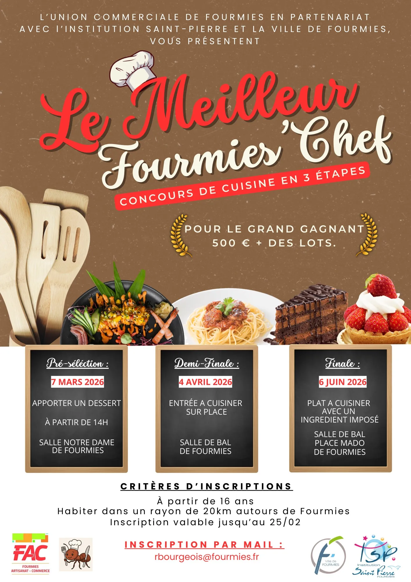 Ça s’adresse à toutes celles et ceux qui aiment cuisiner et relever des défis gourmands, amateurs ou professionnels ! Ce concours est organisé par la FAC (l’union commerciale de Fourmies), en étroite collaboration avec le manager de ville en mairie de Fourmies et la section hôtelière du lycée Saint-Pierre à Fourmies.