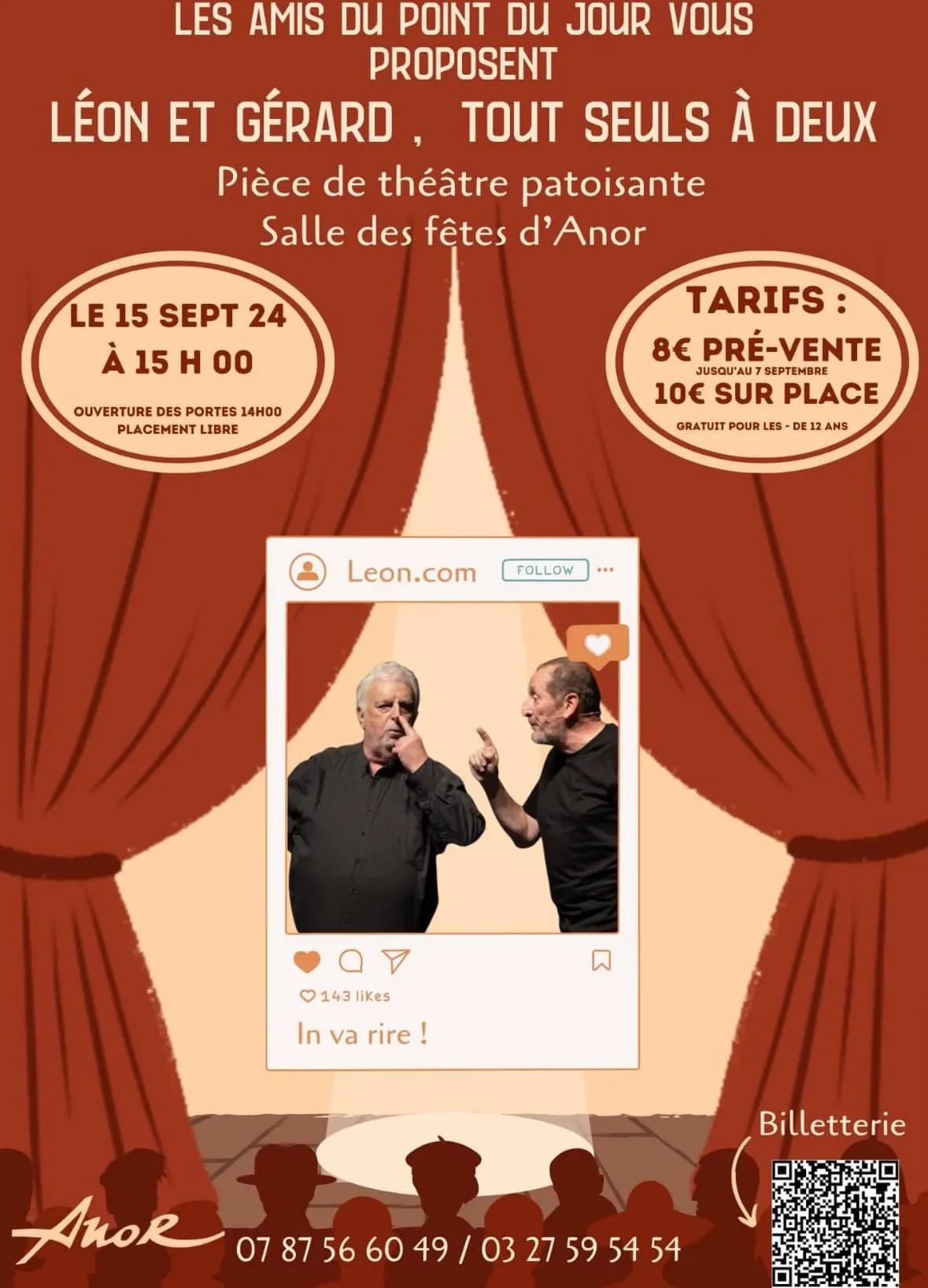 « Léon et Gérard, Tout seuls à deux », c’est le titre d’une pièce de théâtre patoisante, loufoque et irrésistible, à ce dimanche 15 septembre, à 15h, à la salle des fêtes d’Anor. Le droit d'entrée a été fixé à 10€ par personne (gratuit pour les – de 12 ans), et les bénéfices seront reversés au profit du Téléthon.