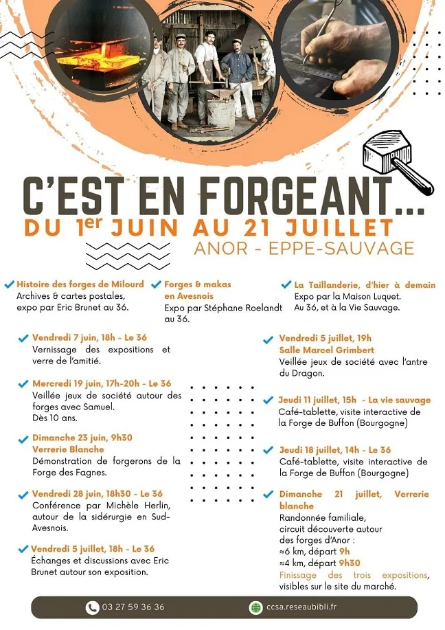 Une grande partie de cette exposition retrace l’histoire des Forges de Milourd, de sa construction en 1576 à sa démolition au 20ème, avant que le site ne soit transformé en base de loisirs. En étroite collaboration avec l’association « la bande de sauvages » d’Eppe-Sauvage, au programme, il y aura dans les prochains jours : des démonstrations de forgerons, des conférences, des randonnées et une présentation des divers métiers liées à la forge. Programme complet à retrouver sur la page Facebook du 36 à Anor !