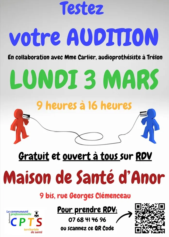 Ce test de votre audition est organisé par la communauté professionnelle territoriale de santé et les libéraux des 12 communes du sud-Avesnois, en collaboration avec Madame Carlier, audioprothésiste à Trélon. Il se déroulera le lundi 3 mars, de 9h à 16h, en non-stop, à la maison de santé d’Anor, 9 rue Georges Clémenceau.