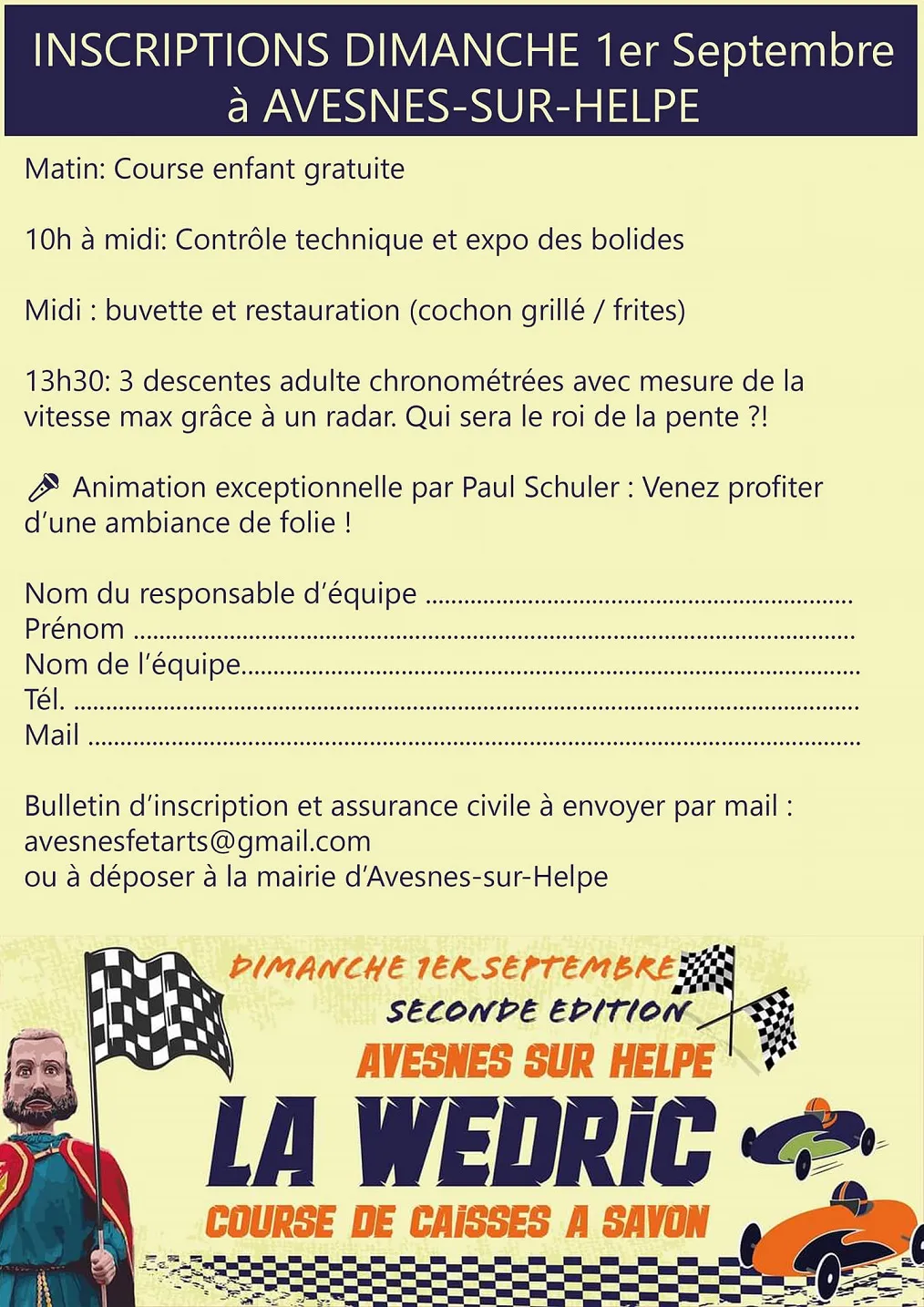 Au programme de cet évènement organisé par l’association « Avesnes Fêt'arts », il y aura en matinée une course pour enfants (gratuite), puis dans l’après-midi, 3 descentes de la rue cambrésienne pour les adultes, avec mesure de la vitesse grâce à un radar, des obstacles à franchir et de beaux cadeaux à gagner pour les équipages !