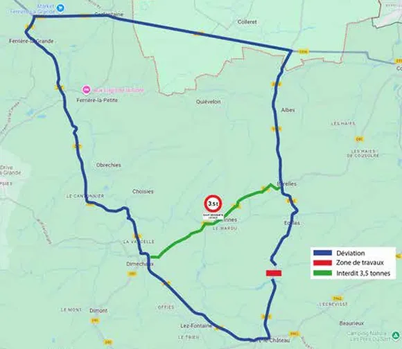 Pendant la durée de cette déviation, la RD 80 sera interdite aux véhicules de plus de 3,5 tonnes (sauf desserte locale) entre Dimechaux et Bérelles.