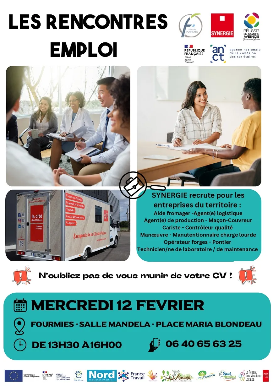 Une nouvelle escale des « rencontres de l’emploi » est programmée ce mercredi 12 février, de 13h30 à 16h, à la salle Mandela à Fourmies (place Maria Blondeau, à côté du musée du textile et de la vie sociale). Ce « job datting » est organisé à l’initiative de la ville de Fourmies, l’agence d’intérim Synergie, Réussir en Sambre-Avesnois et l’agence nationale de la cohésion des territoires.