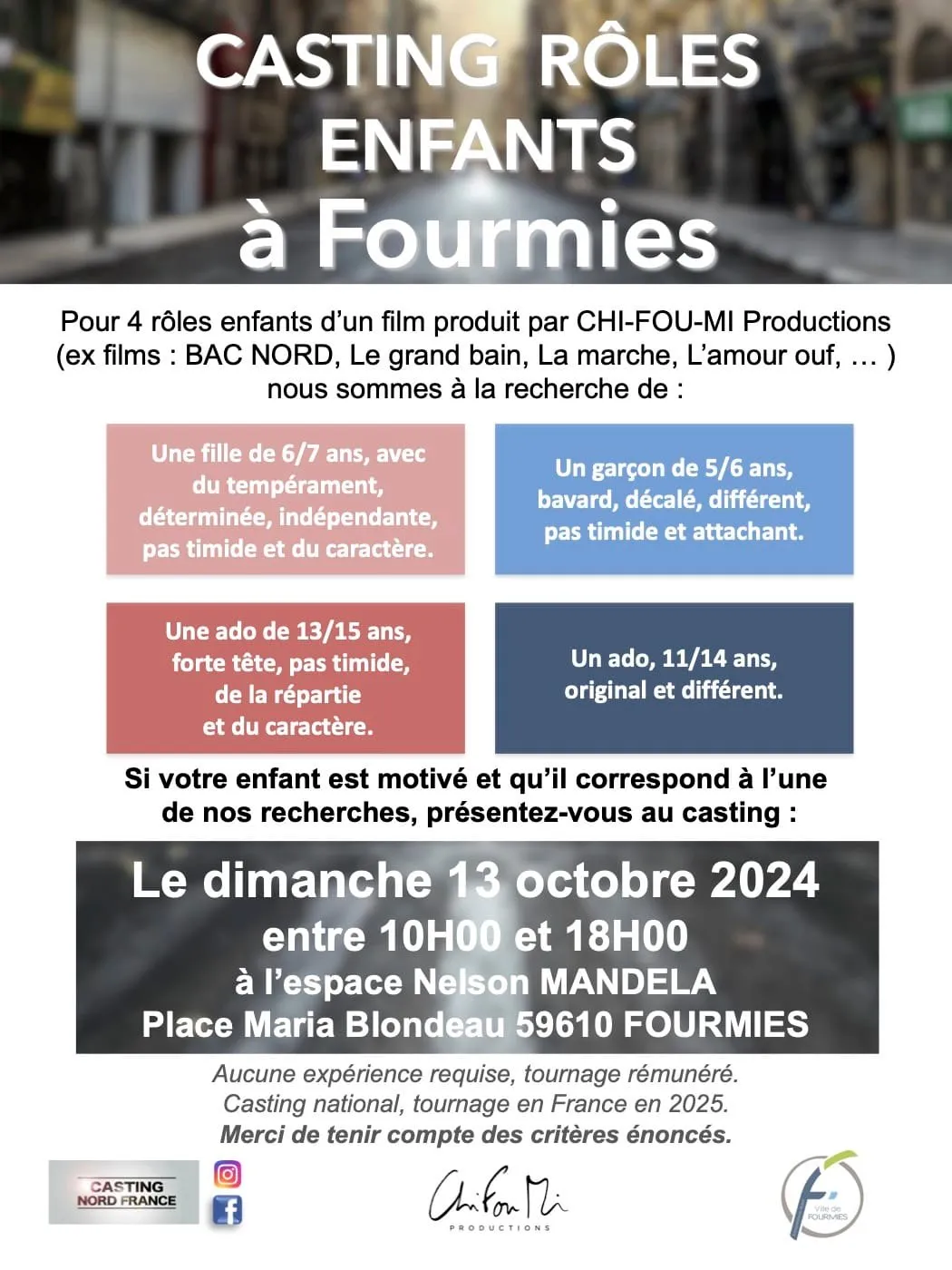 Aucune expérience n’est nécessaire ! C’est un tournage rémunéré. Pas de photo à envoyer, il suffit de se présenter au casting le 13 octobre à Fourmies.
