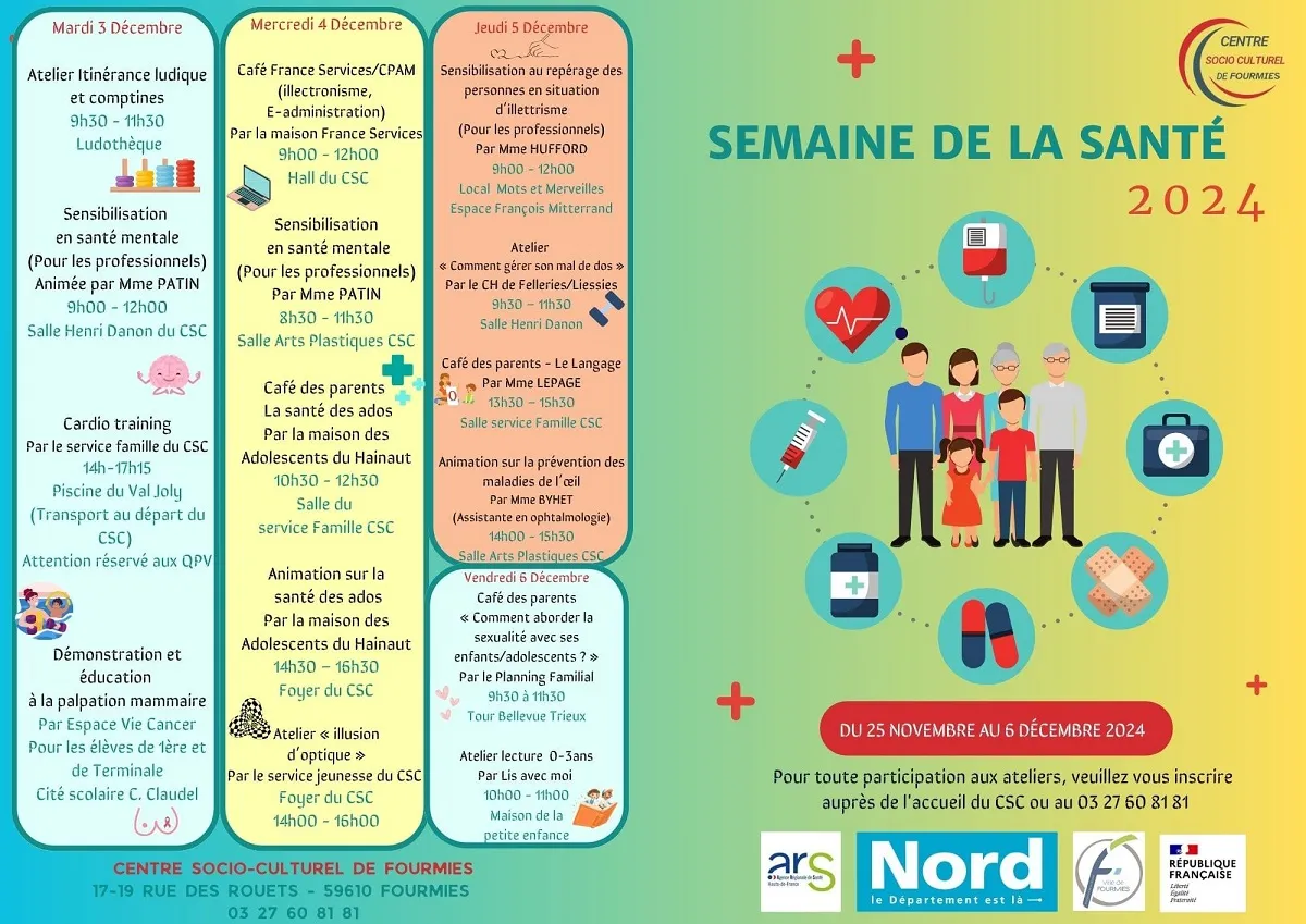 Trois thèmes ont été retenus cette année : les difficultés du langage, la gestion des douleurs physiques et mentales et la prévention des maladies de l’œil. Pour participer aux ateliers, il faut s’inscrire gratuitement en se rendant directement à l'accueil du CSC à Fourmies ou en téléphonant au 03 27 60 81 81.