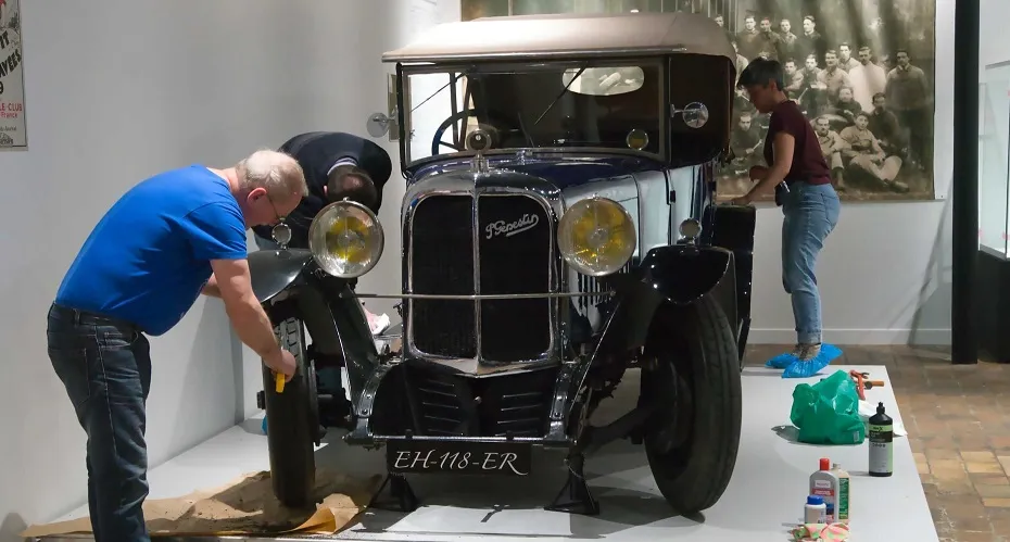 Avec l’aide du garage Hannecart à Sains-du-Nord et des salariés du service technique de l’écomusée de l’avesnois, deux autres bénévoles, Daniel Michaux et Roland Letoret, ont entrepris une remarquable restauration de ce véhicule unique au monde ! Alors que le premier s’attaquait à la mécanique et à la tôlerie, le second bénévole, menuisier à la retraite, a rénové toute la boissellerie et la sellerie. Le garage Hannecart a fini le travail par la tôlerie et la peinture.