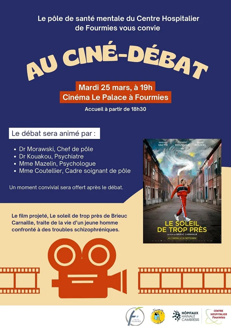 C’est aujourd’hui la journée mondiale de la Schizophrénie ! A cette occasion, le Pôle Santé Mentale du Centre Hospitalier de Fourmies organisé un ciné-débat, ce mardi 25 mars, à 18h30, au cinéma Le Palace ! La projection du film « Le soleil de trop près » sera suivie d’un débat animé par des professionnels de la santé mentale.