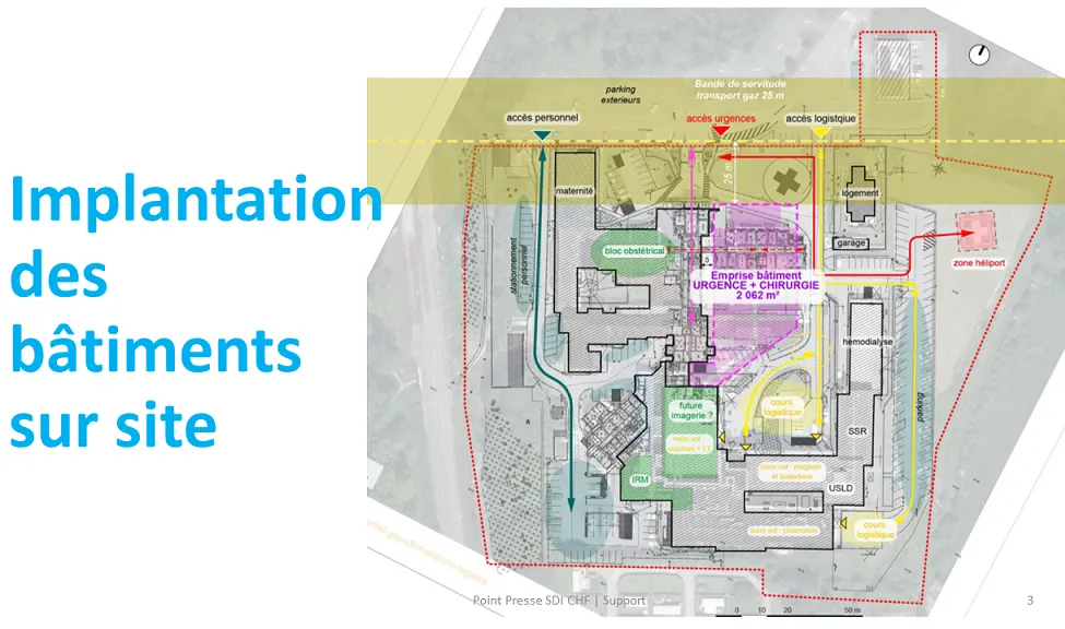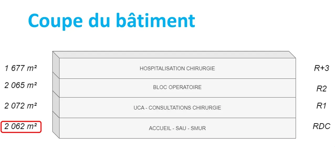 Un nouveau bâtiment de 7000m2 et sur 4 niveaux, y sera construit pour y abriter les urgences et le SMUR, les consultations et la chirurgie au 1er étage, les blocs opératoires et les lits d’hospitalisation au 3ème étage.