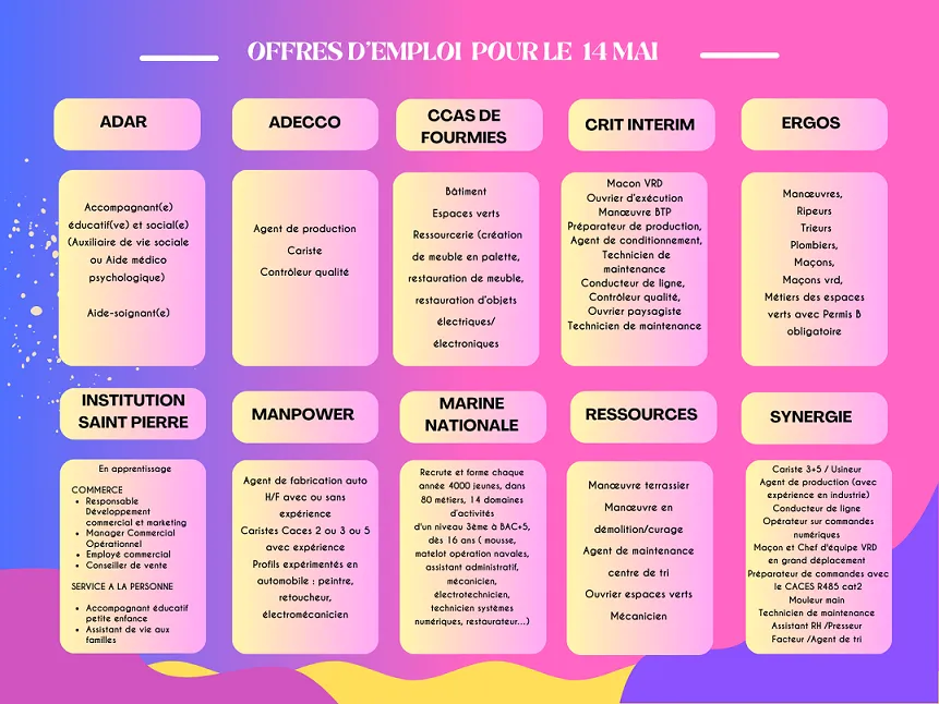 Si vous êtes à la recherche d’un job dans le sud-Avesnois, vous êtes invités aujourd’hui aux « Rencontres de l’emploi », qui auront lieu chaque mois dans un quartier différent de Fourmies ! Vous avez rendez-vous ce mercredi 14 mai à l’Ecomusée de l'avesnois (musée du textile et de la vie sociale), place Maria Blondeau, de 13h à 16h ! N’oubliez pas de venir avec des CV pour postuler et rencontrer sur place les recruteurs !
