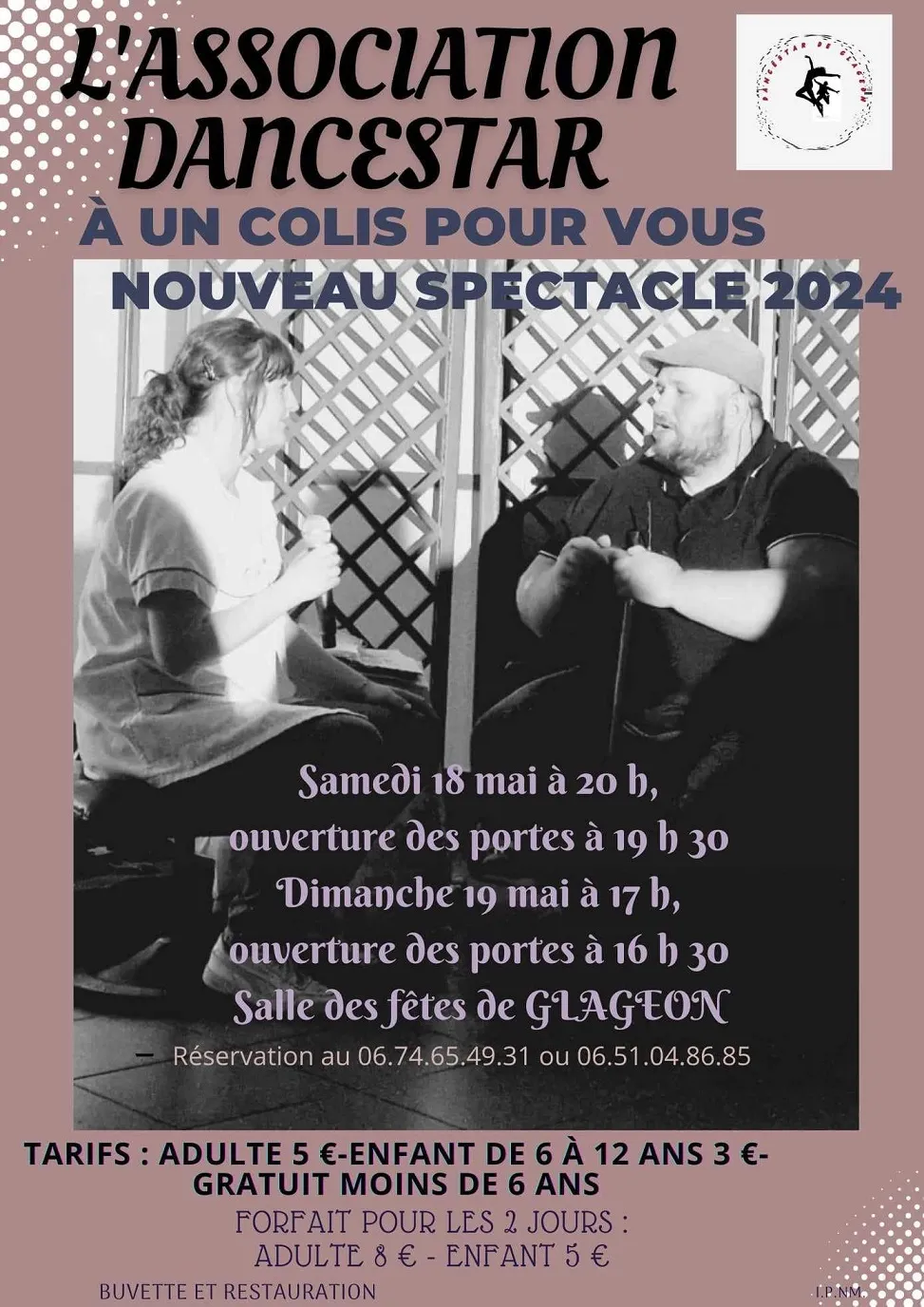 C’est ce week-end que sera présenté le nouveau spectacle de l'association « Dance star » à la salle des fêtes de Glageon. Baptisé « Un colis pour vous », ce spectacle sera joué à 2 reprises : samedi 18 mai à 19h30 et dimanche 19 mai à 16h30. Buvette et restauration sur place.
