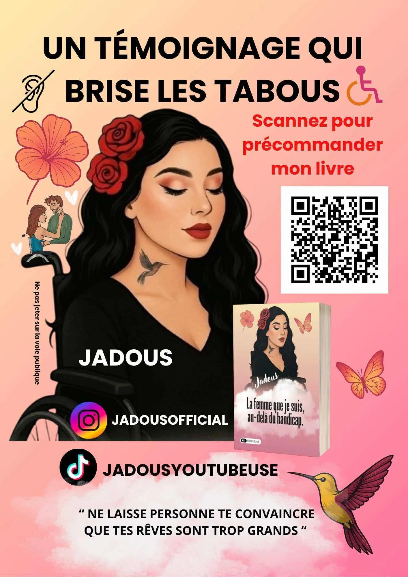 Le 26 septembre 2025, Jadous publie en précommande son tout premier livre : « La femme que je suis au-delà du handicap ».