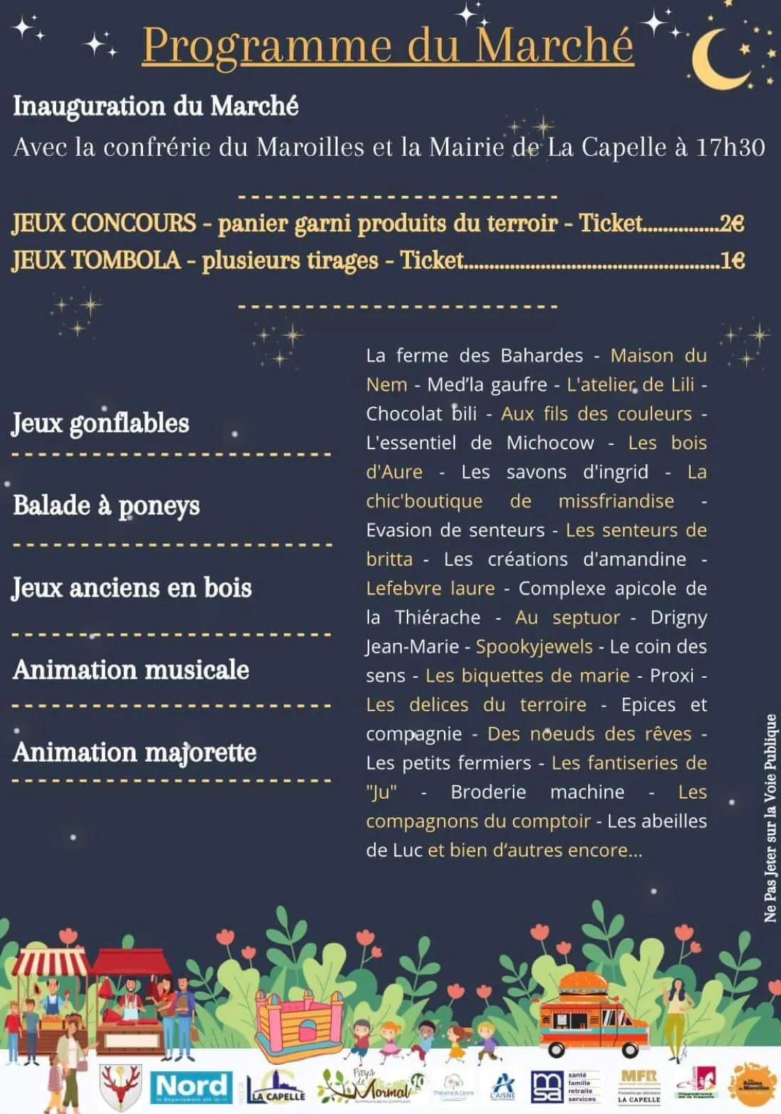 Cet événement est organisé par les élèves en BTSA développement, animation des territoires ruraux, de la maison familiale capelloise. En partenariat avec l’association « Les routes de Maroilles », ce marché campagnard semi-nocturne se déroulera à partir de 17h30 et jusqu’à 23h à l’hippodrome international de La Capelle.