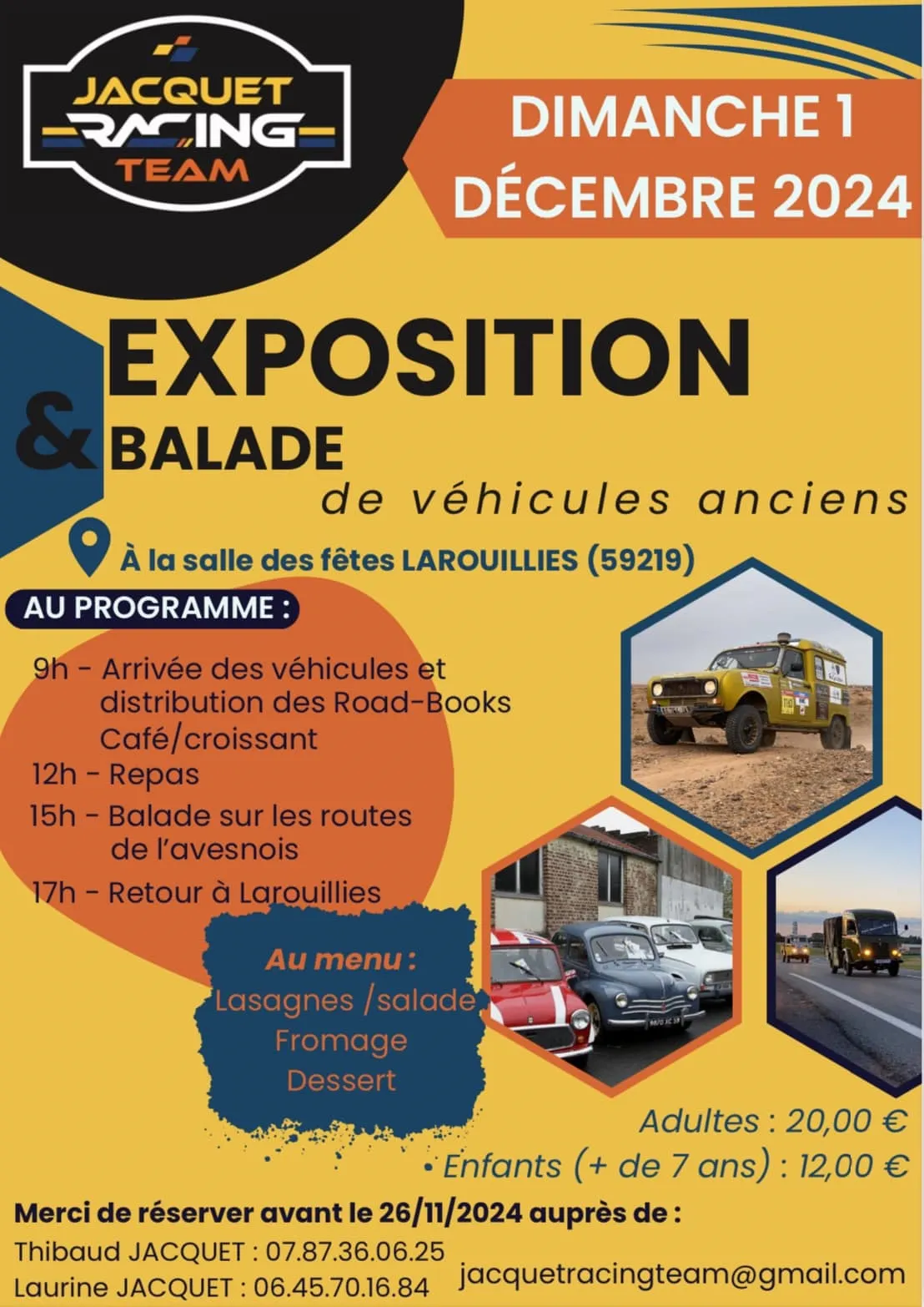 Les amateurs de voitures anciennes et de collection ont rendez-vous le dimanche 1er décembre à Larouillies. Cet événement sera organisé par l’association « Jacquet Racing Team », avec buvette et restauration sur place ! Tous les profits de cette journée dédiés aux véhicules de collection serviront à financer leur 2ème participation au 4L Trophy en février 2025.