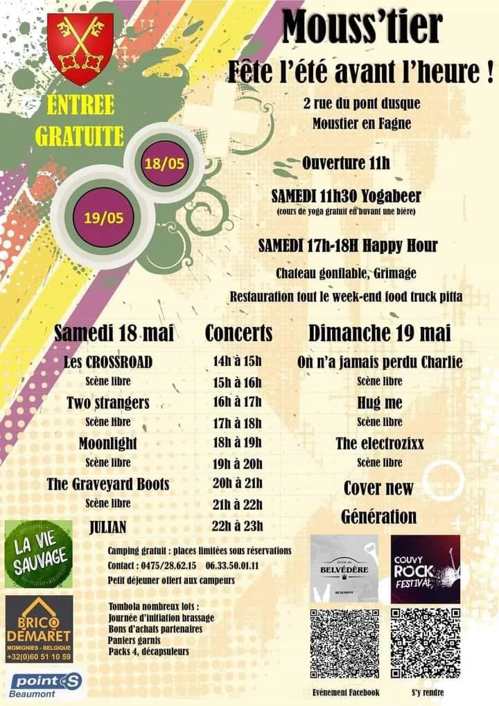 Vous avez rendez-vous ce samedi 18 et dimanche 19 mai à Moustier-en-Fagne. L,a brasserie de la Mouss'tier, située au n°2 de la rue du pont Dusque, accueillera une dizaine de groupes, ce samedi dès 14h et jusqu’à 23h (Les Crossroad, Two Strangers, Monlight, The Graveyard Boots et Julian) et dimanche aux mêmes horaires, avec une scène libre aux artistes, les groupes « On n’a jamais perdu Charlie », Hug me, The électrozixx, Cover new, Génération). Entrée gratuite
