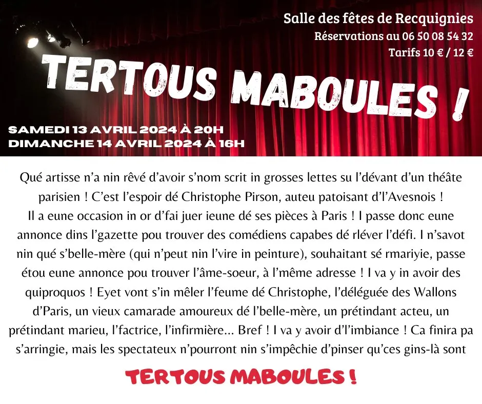 Plus de 400 places ont déjà été vendues pour les 2 premières représentations qui auront lieu ce samedi à 20h et dimanche à 16h. Face à un tel succès, une troisième représentation de « Tertous Maboule » est d’ores et déjà programmée le 25 mai toujours à la salle des fêtes de Recquignies.