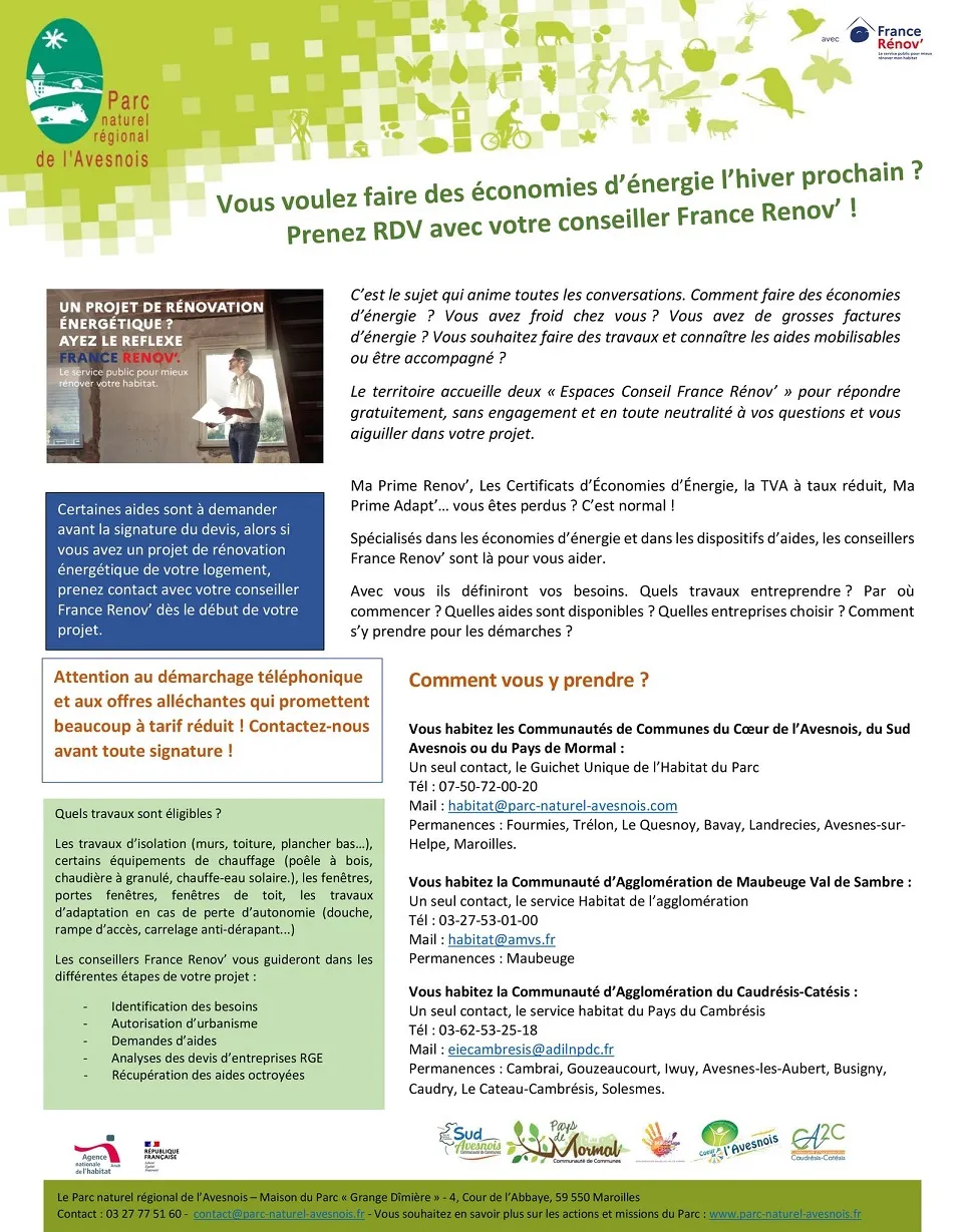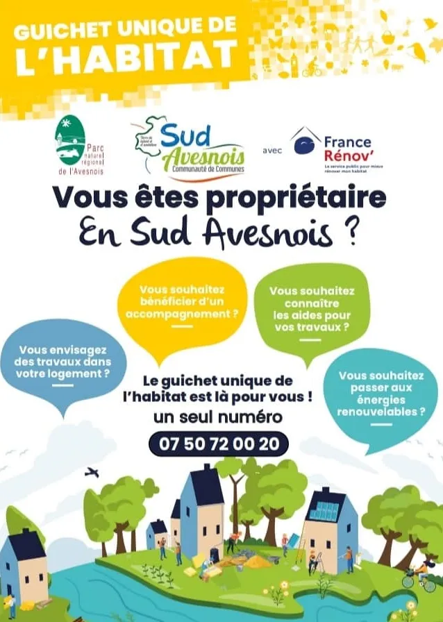 Pour éviter les arnaques et s’y retrouver dans la multitude des aides mobilisables, il vous est conseillé de contacter le Guichet Unique de l’Habitat, au 07 50 72 00 20. Des permanences sont aussi proposées à la maison du Parc à Maroilles, en mairie de Trélon et Fourmies, dans le Cœur de l'Avesnois et au Pays de Mormal.