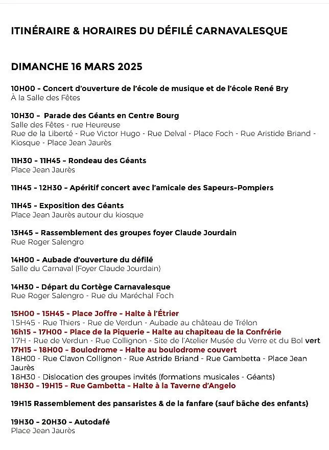 Comme le veut la tradition, après une traditionnelle vente de costumes ce vendredi et samedi, à la salle des fêtes Trélonaise, dimanche, les festivités commenceront vers 10h30 par une aubade, suivie par une parade des géants Belges et des Hauts-de-France...
