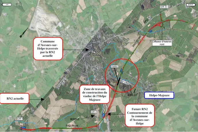 La direction régionale de l’environnement, de l’aménagement et du logement (DREAL) des Hauts-de-France, maître d’ouvrage, procède depuis mars 2023 aux travaux de construction du viaduc de l’Helpe Majeure. Cet ouvrage permettra le franchissement de la rivière de l’Helpe Majeure et de la RD133 par la future RN2.