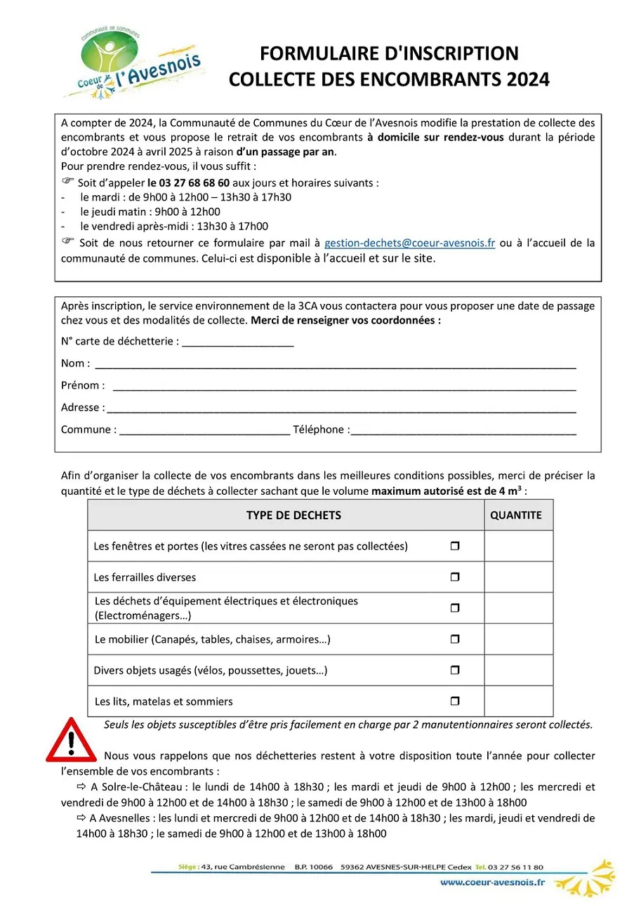 - Par formulaire disponible à l'accueil de la 3CA (43 Rue Cambrésienne, Avesnes-sur-Helpe)